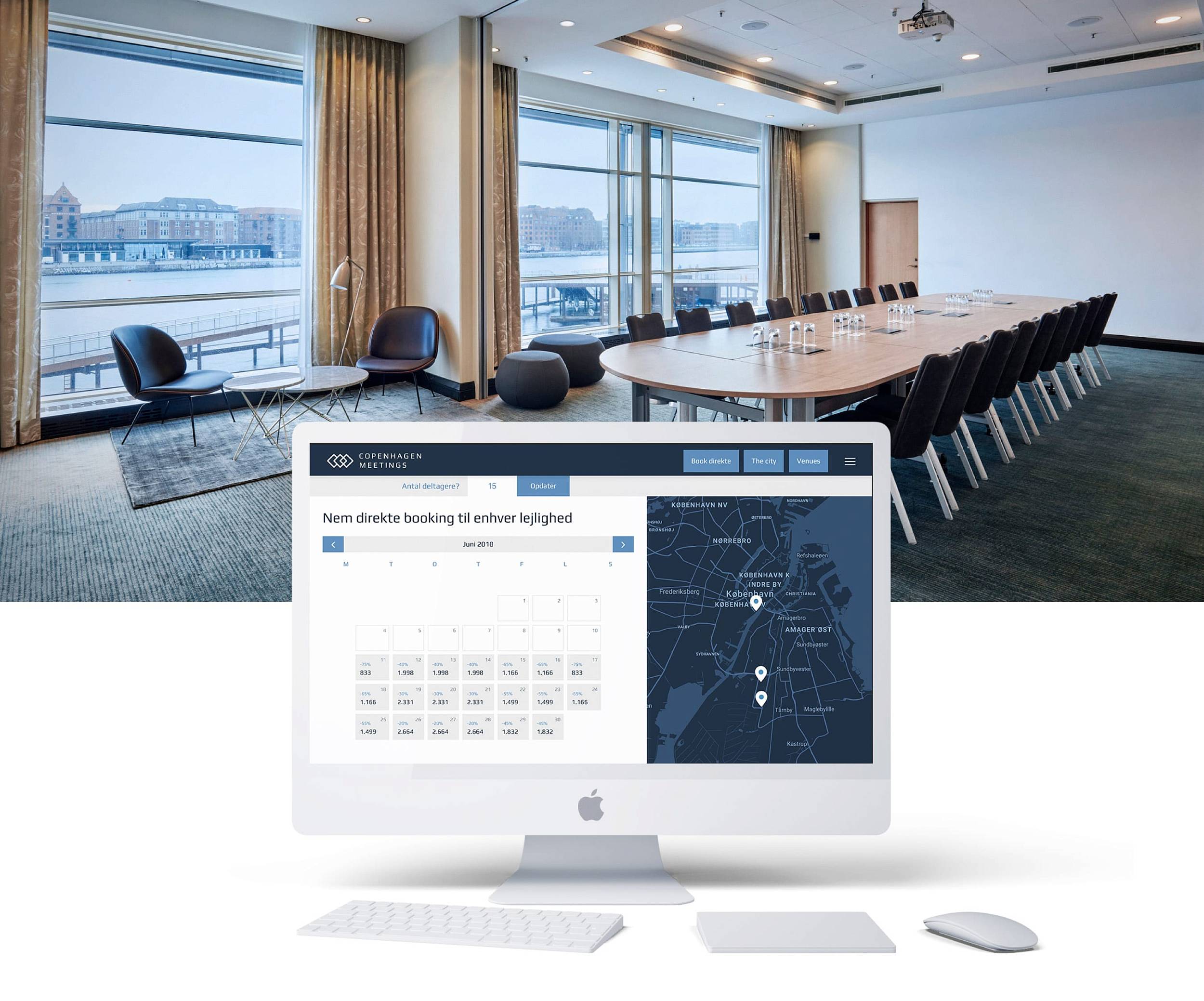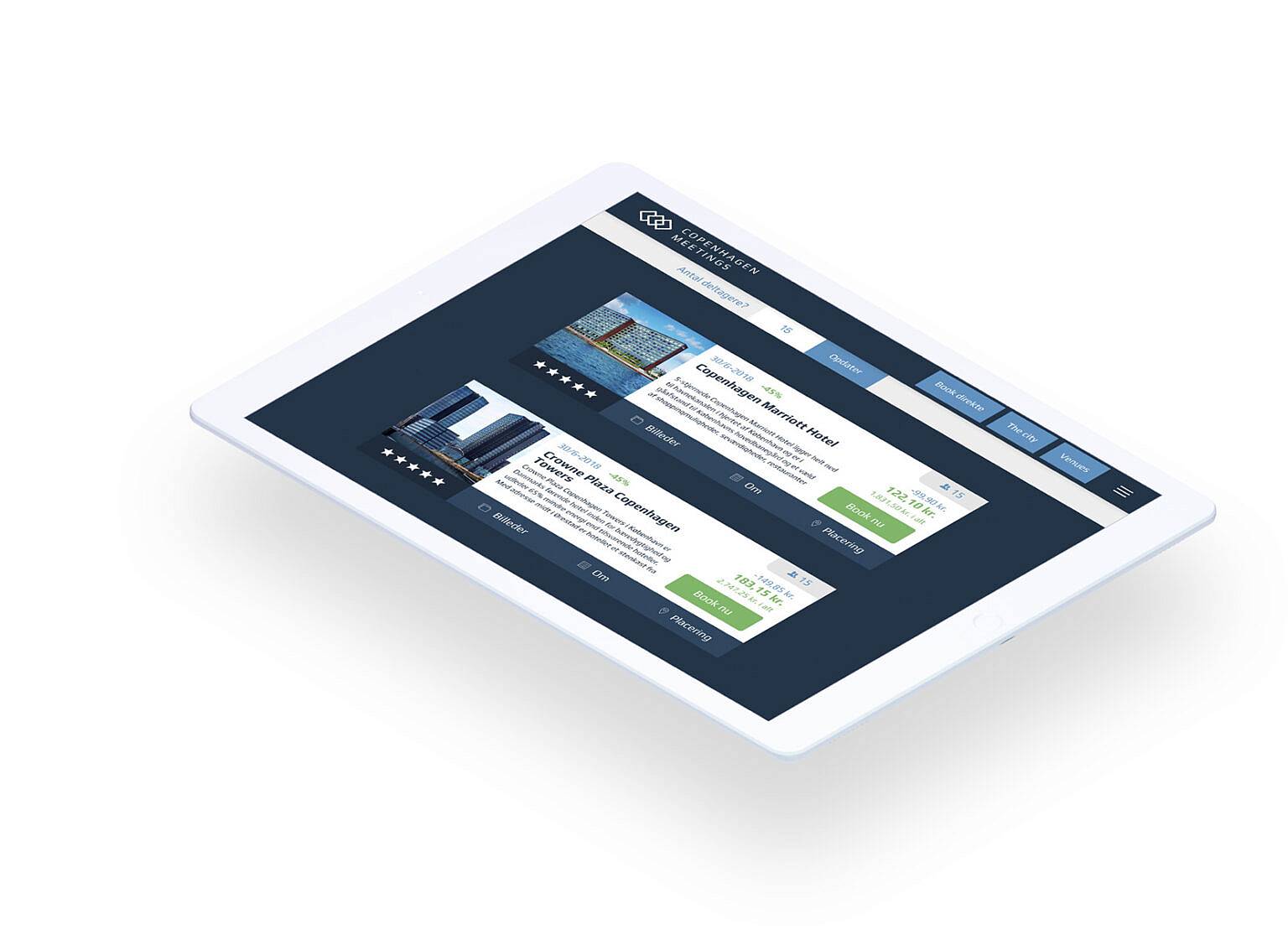 Copenhagen Meetings offers direct booking of meeting rooms at Crowne Placa, Marriott Copenhagen or Comwell CCC.