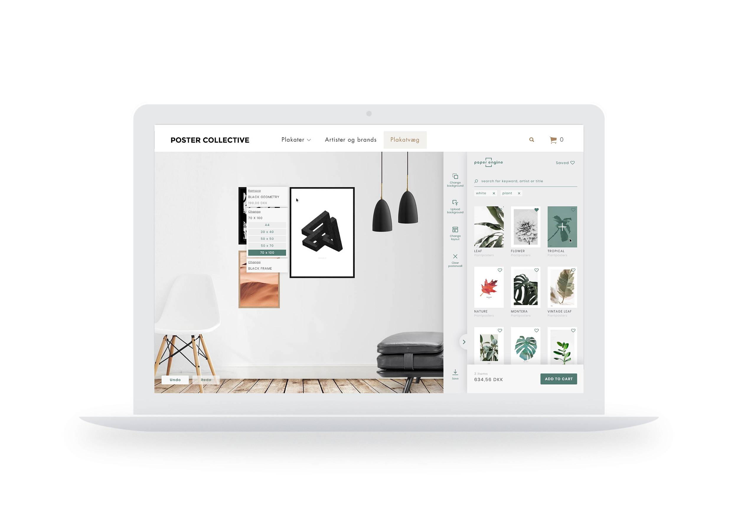 We developed a tailored feature where users on the site can easily and quickly drag and drop posters around and see them on a wall, e.g. their own wall via the mobile camera. We had never seen this feature done properly, so we decided it should work without any compromise to the user experience.